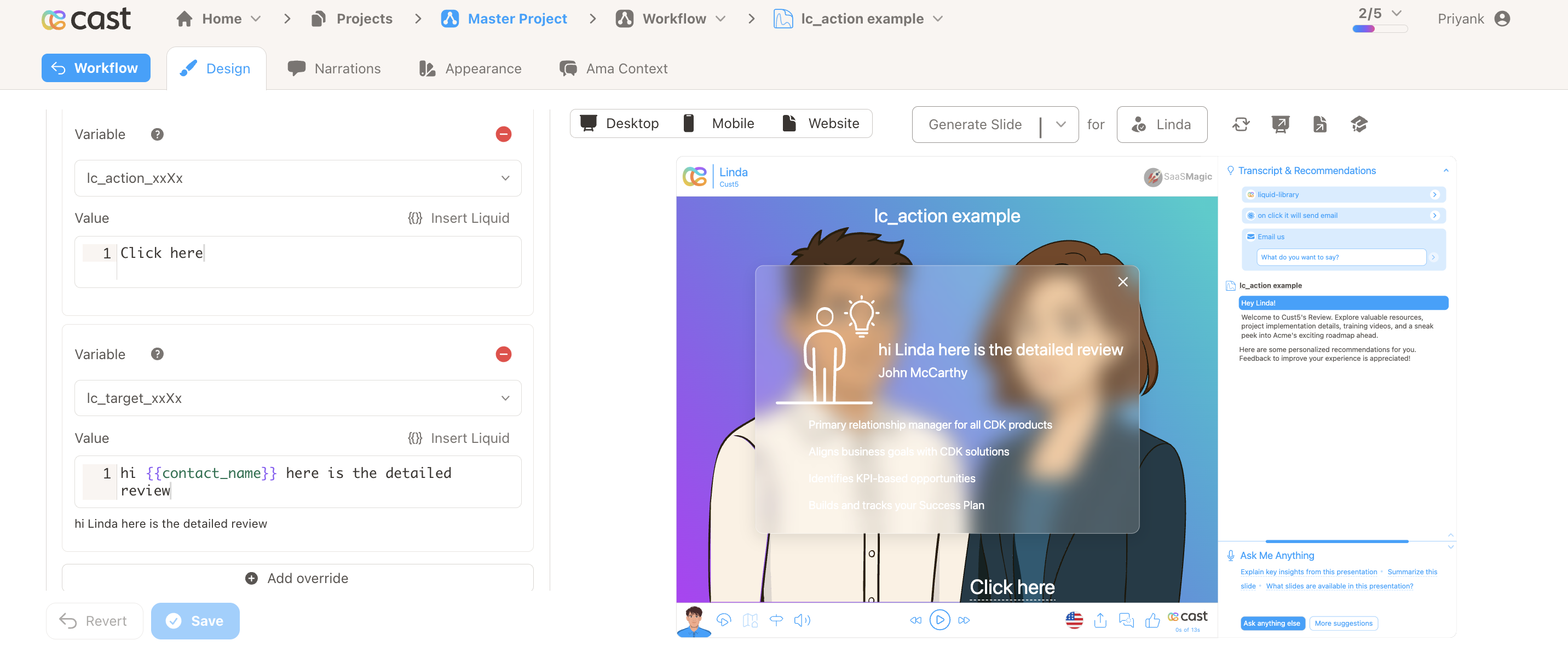 lc_action_ and lc_target_ work together to create an interactive click-to-reveal experience inside SVG slides. An lc_action_* element renders as a clickable underlined label. When clicked, the matching lc_target_* group opens in a frosted-glass modal overlay, with optional narration text read aloud via TTS.