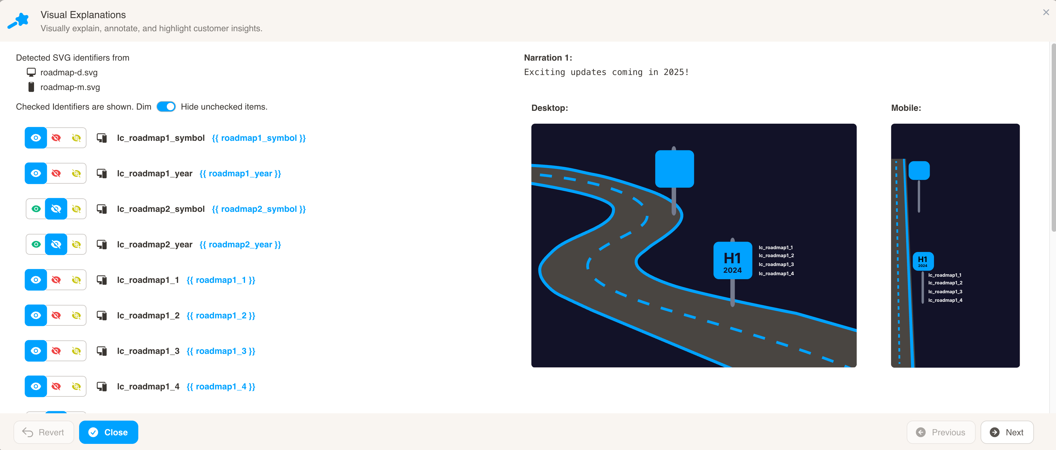 When you upload an SVG file to a personalized graphic scene, the system automatically detects available highlights and makes them available in the narration editor.