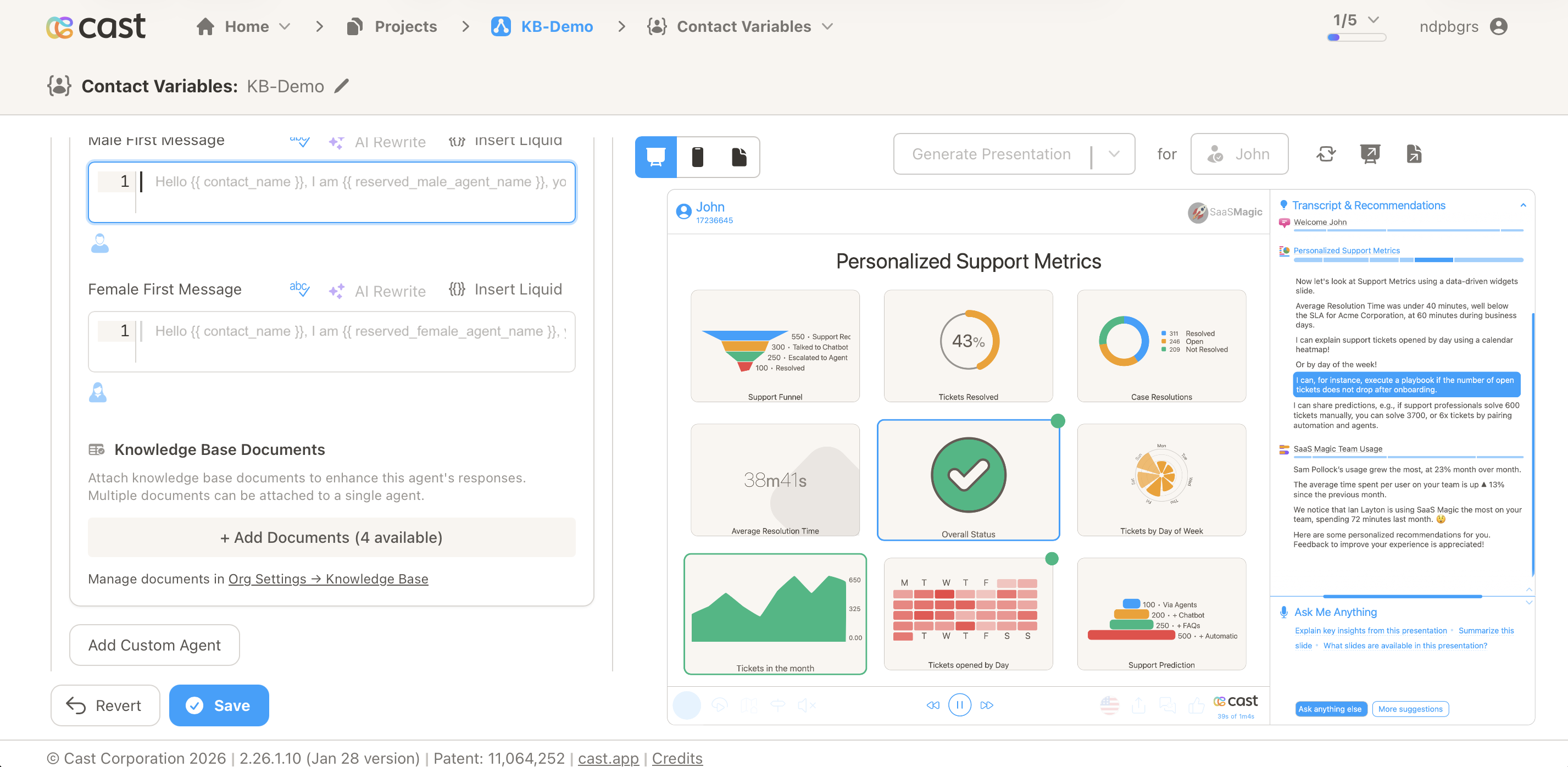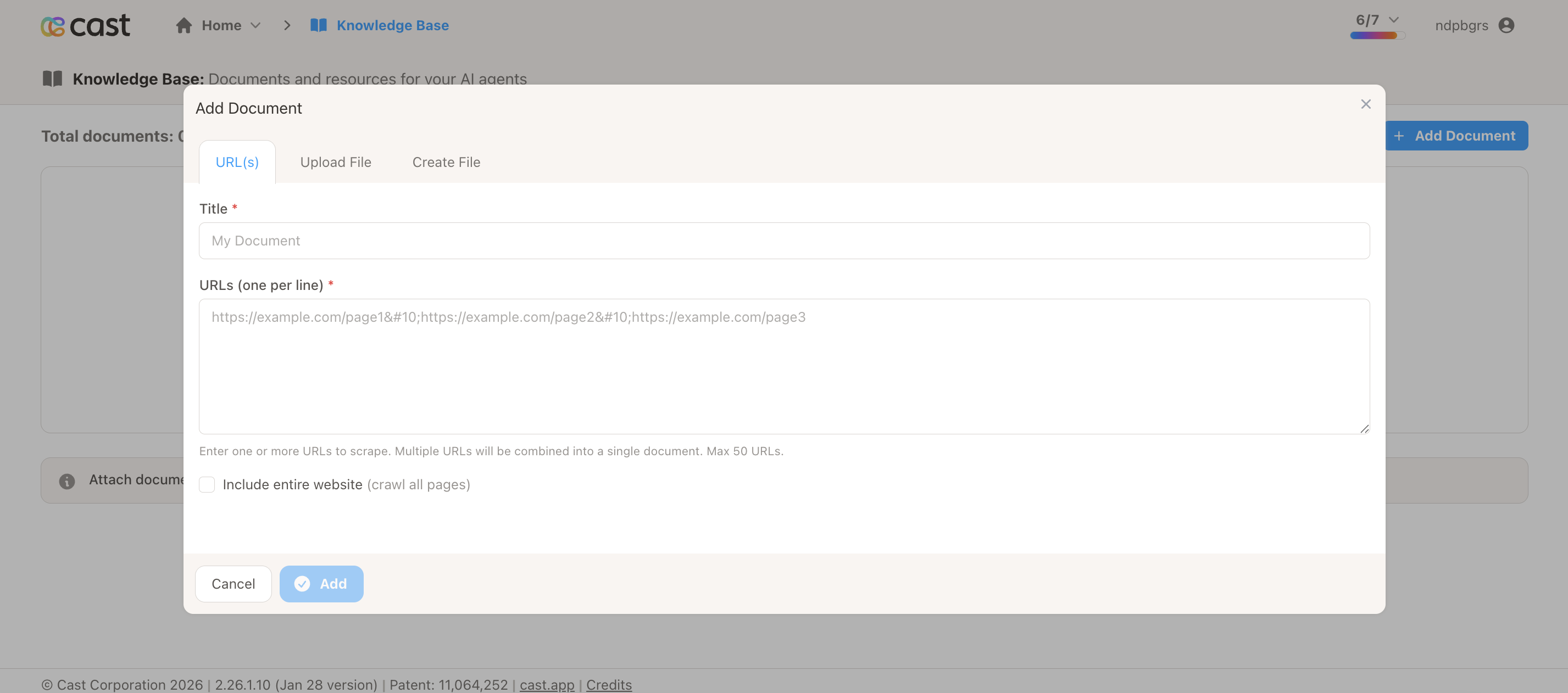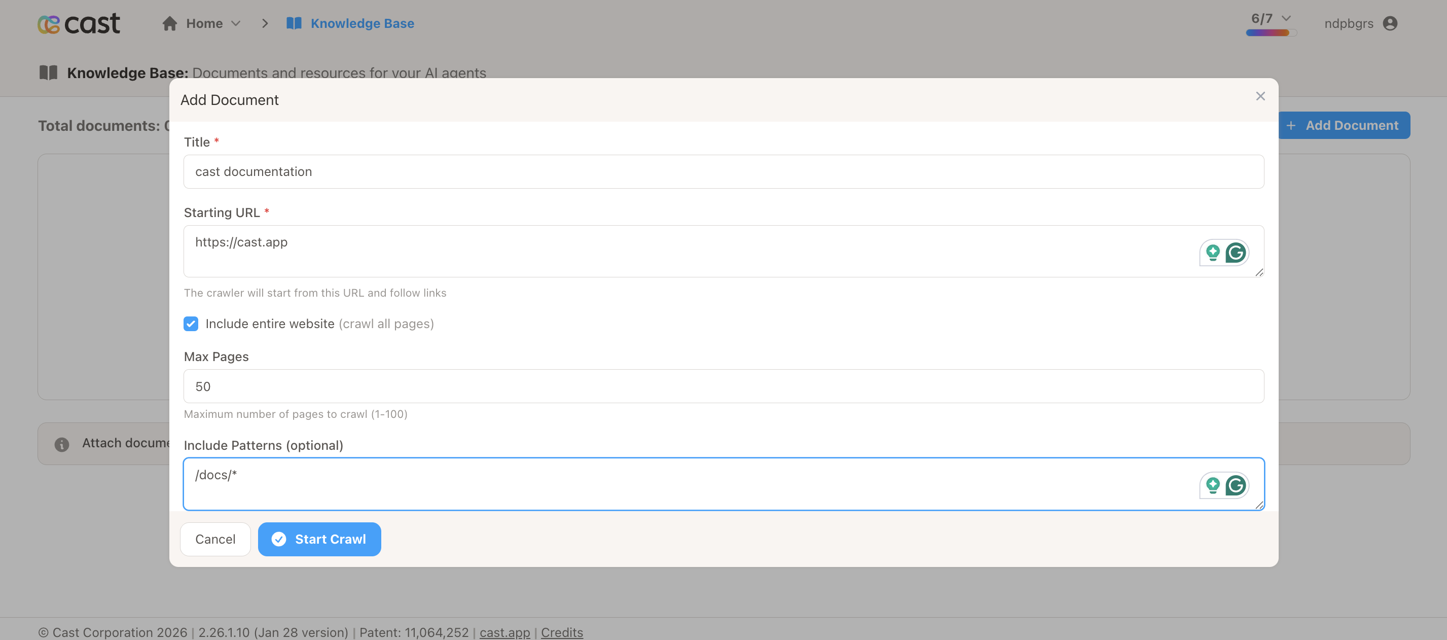- Agent ID configured - Contact support@cast.app to set up your agent ID (the Knowledge Base Documents section will appear after this is configured)