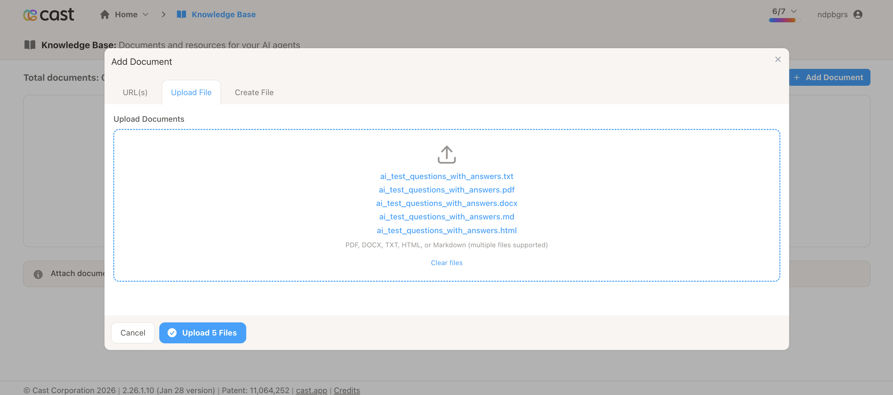Note: The Knowledge Base Documents section will appear after your agent ID is configured. If you don’t see it, contact support@cast.app to set up your agent ID.