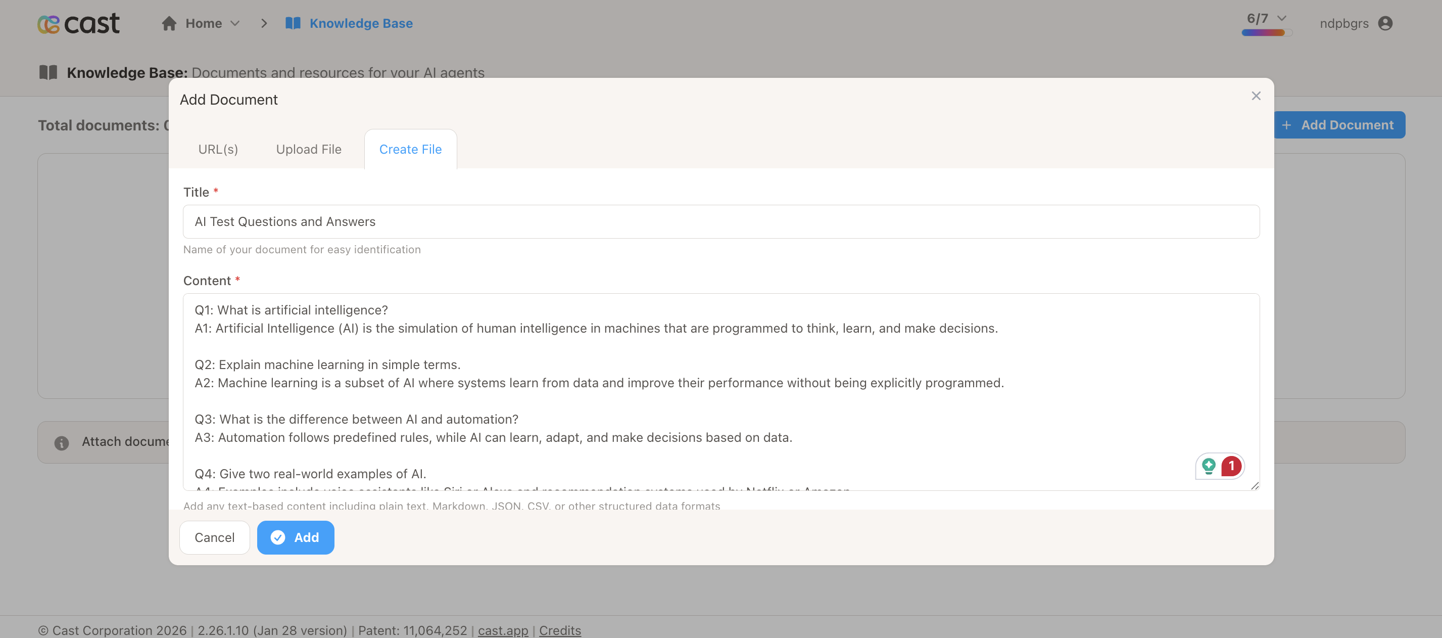 Example: If you uploaded a product FAQ, ask “What is Cast?” or “How much does it cost?”
