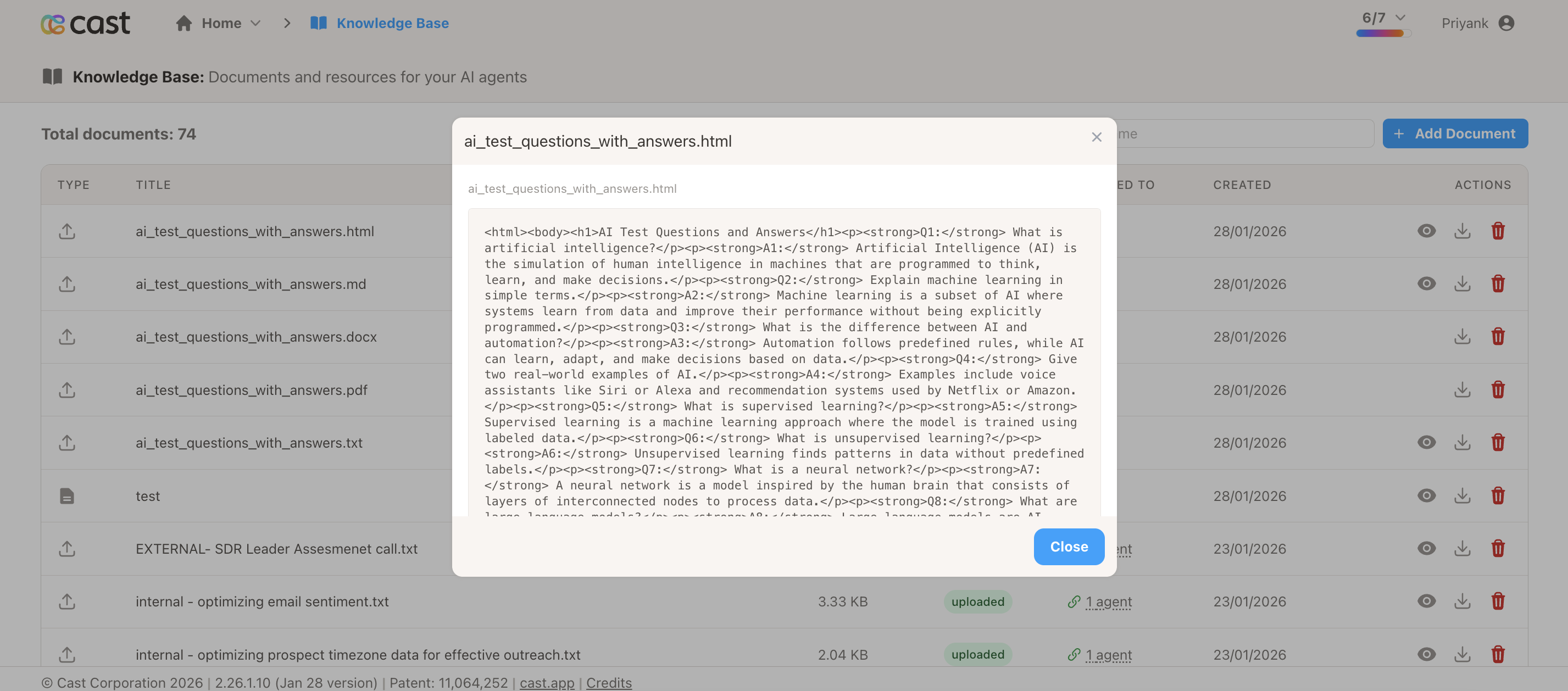 Warning: If the document is attached to any agents, you must detach it first before deletion is allowed.