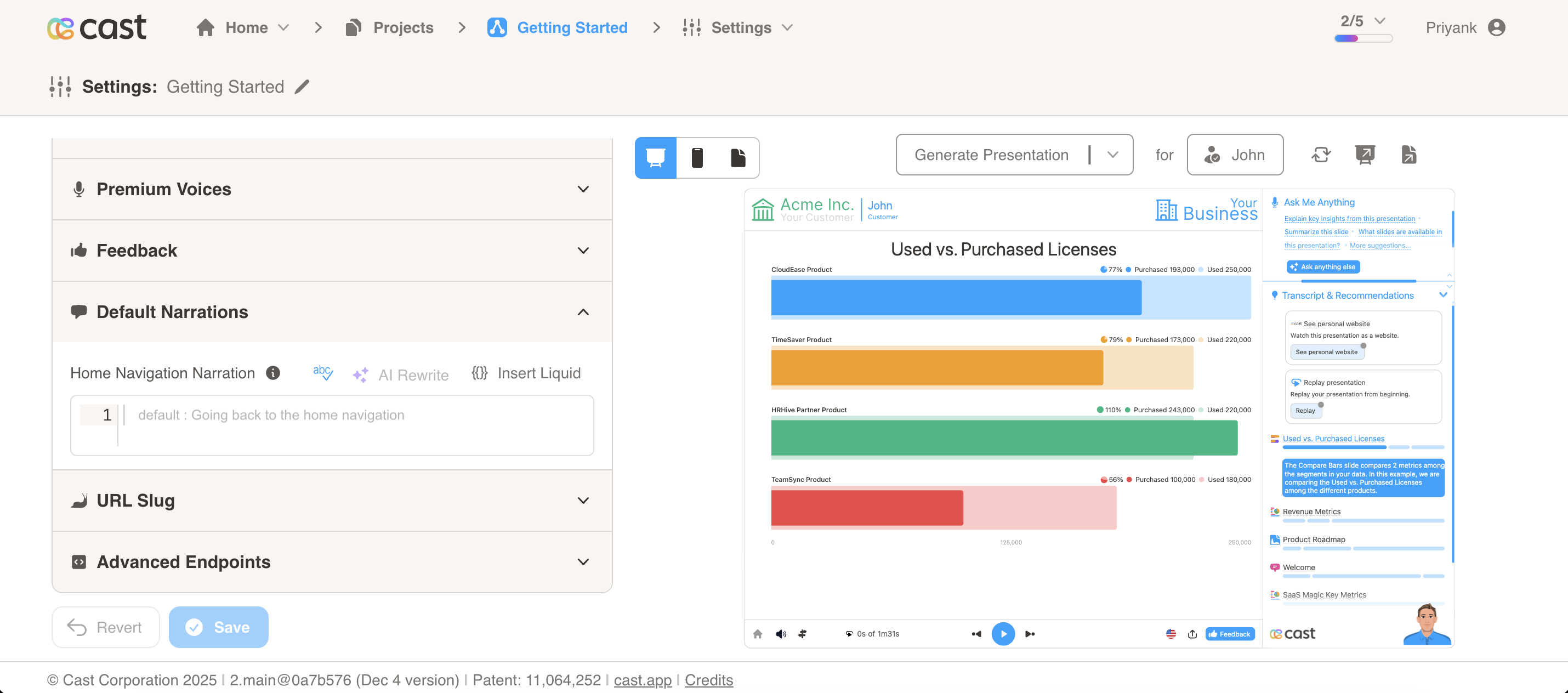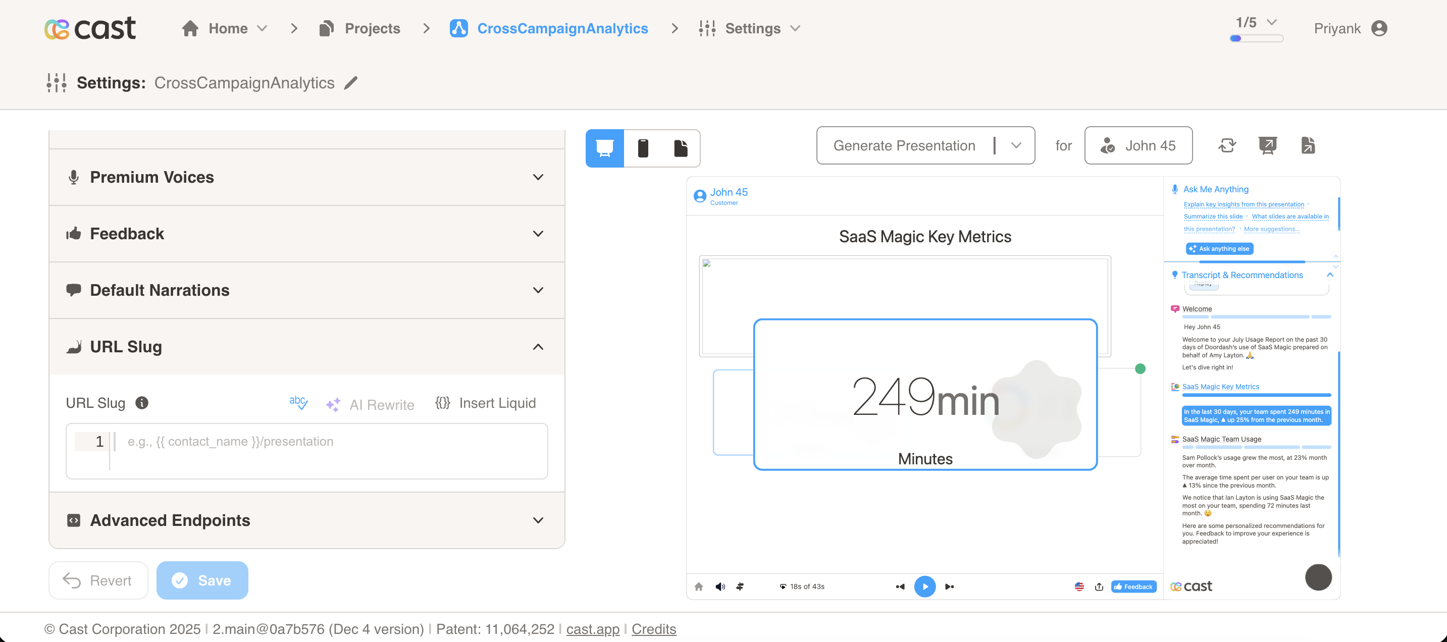 Add a custom slug to personalize cast presentation and website URLs. The slug supports Liquid template variables, enabling dynamic URL generation based on contact data.