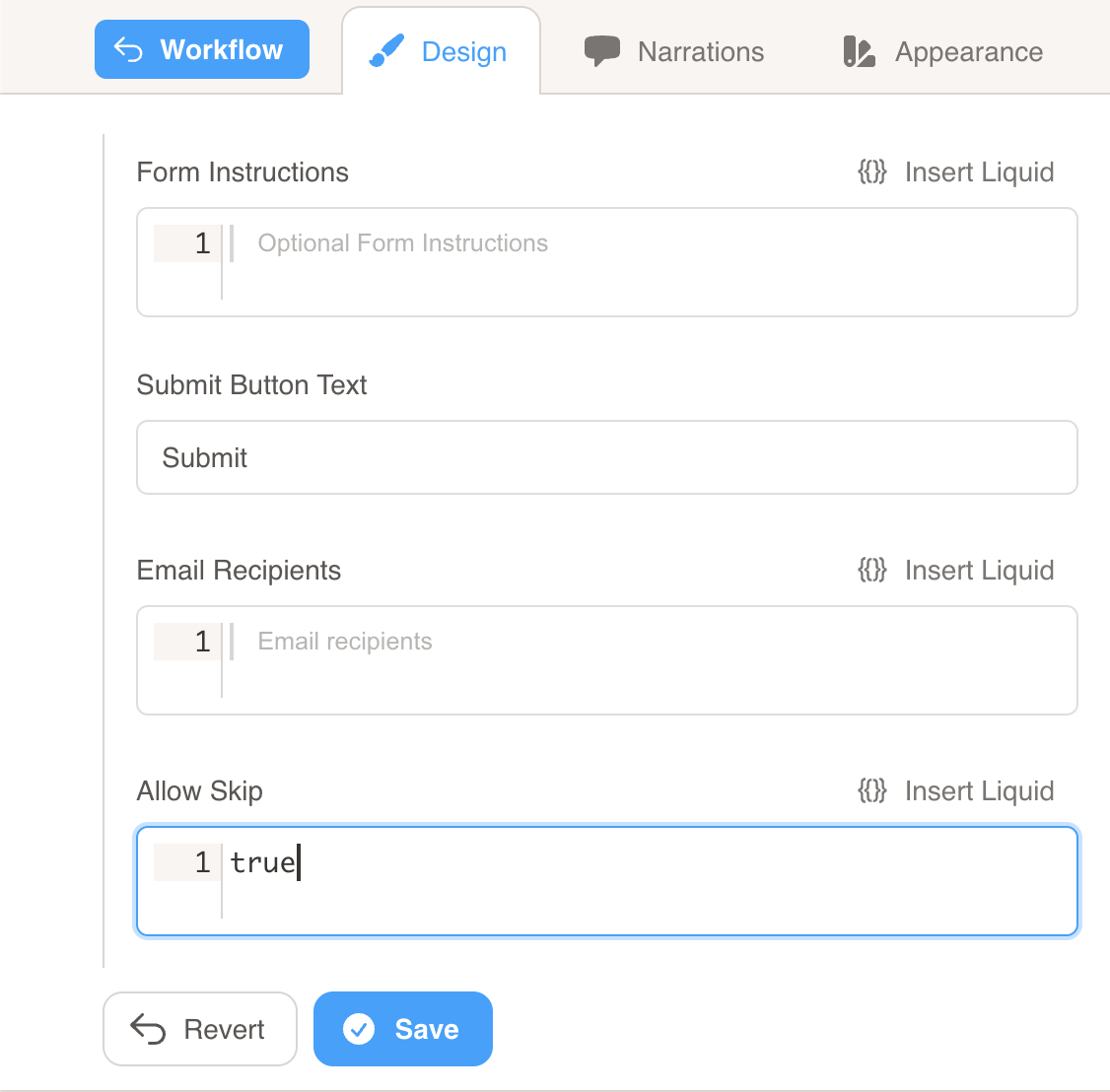 Enable the Allow Skip option to allow users to skip individual questions in your form. When enabled, users will see a โSkipโ button. This field has validation and defaults to empty (disabled) when creating a new form.