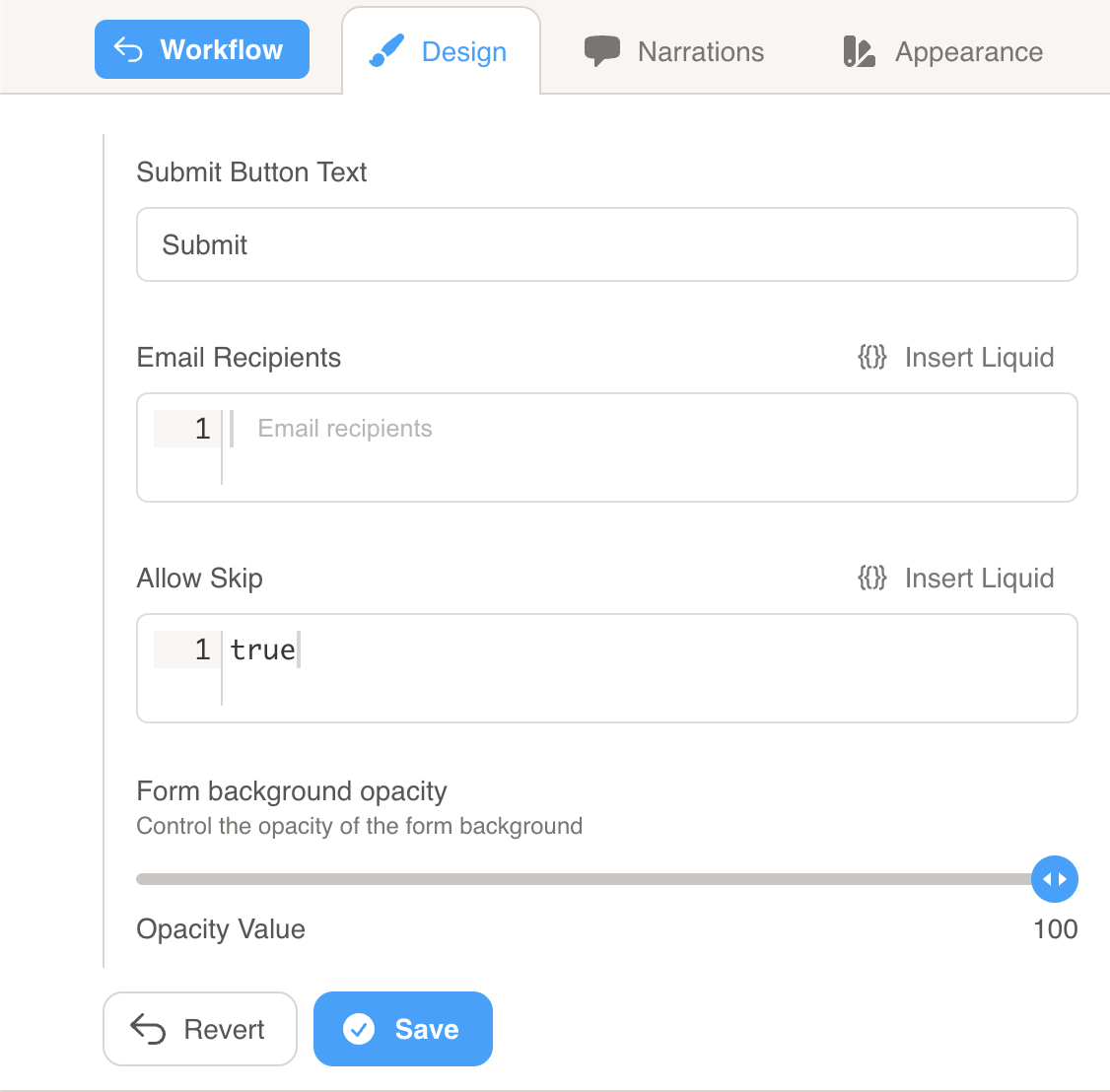 Control the visual appearance of your form with the Form Background Opacity slider. Adjust the transparency from 0 (completely transparent) to 1 (completely opaque). The default value is 0.15, and you can see a live preview while editing.