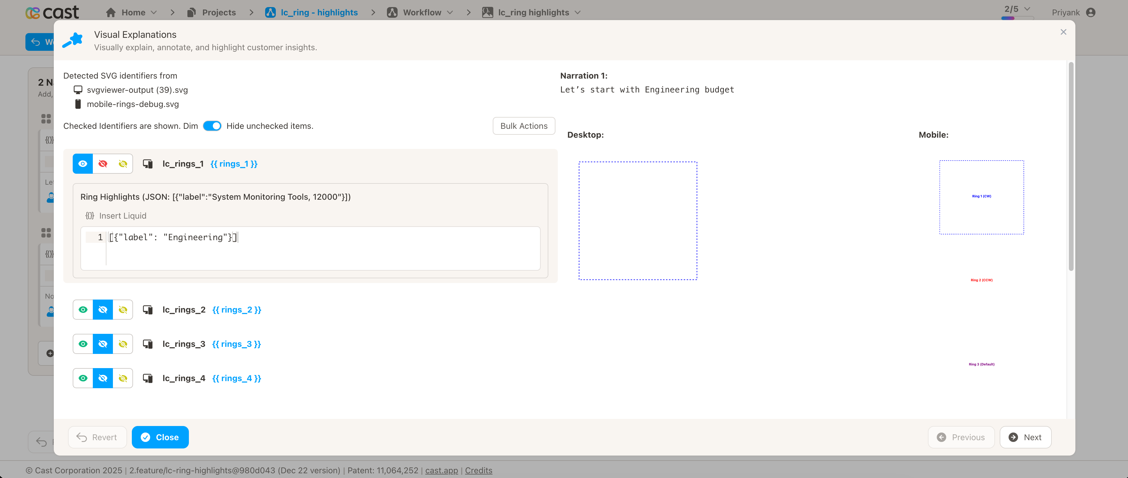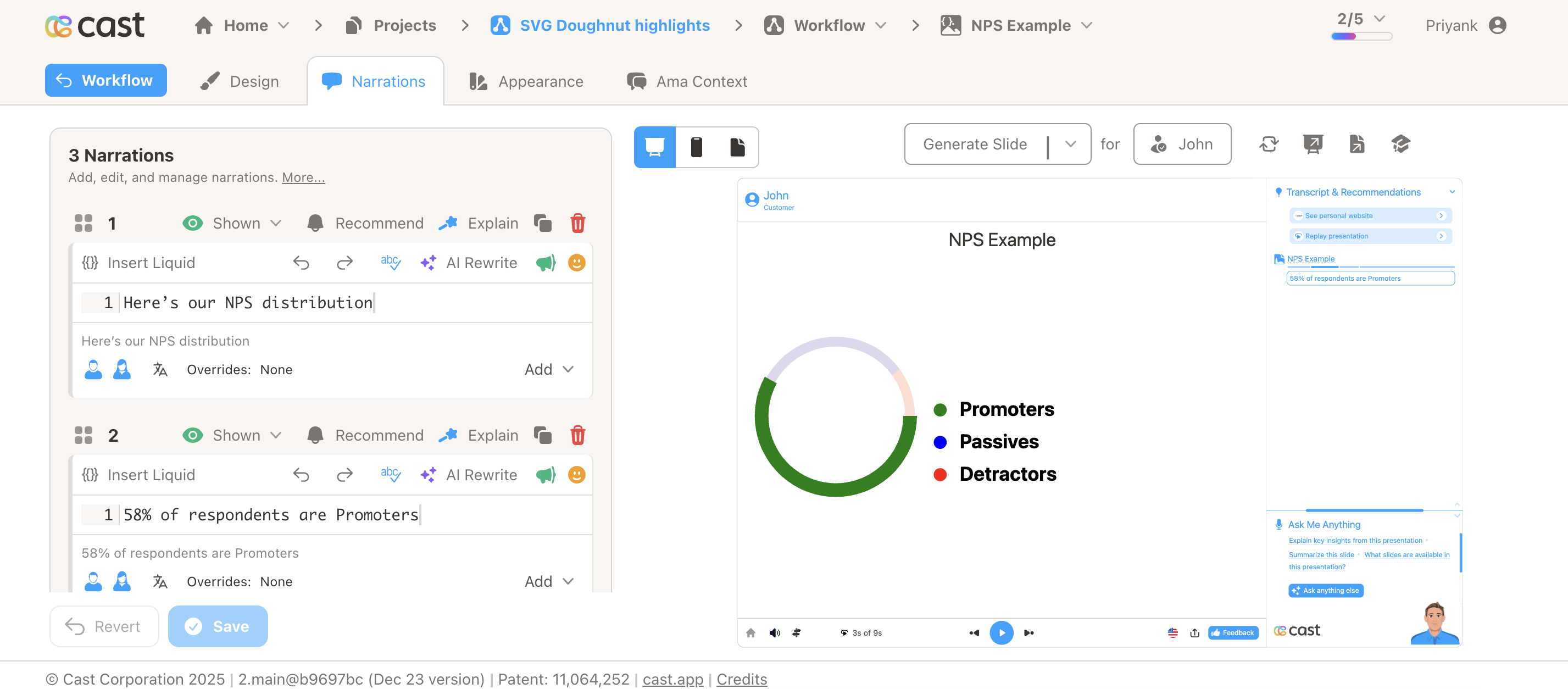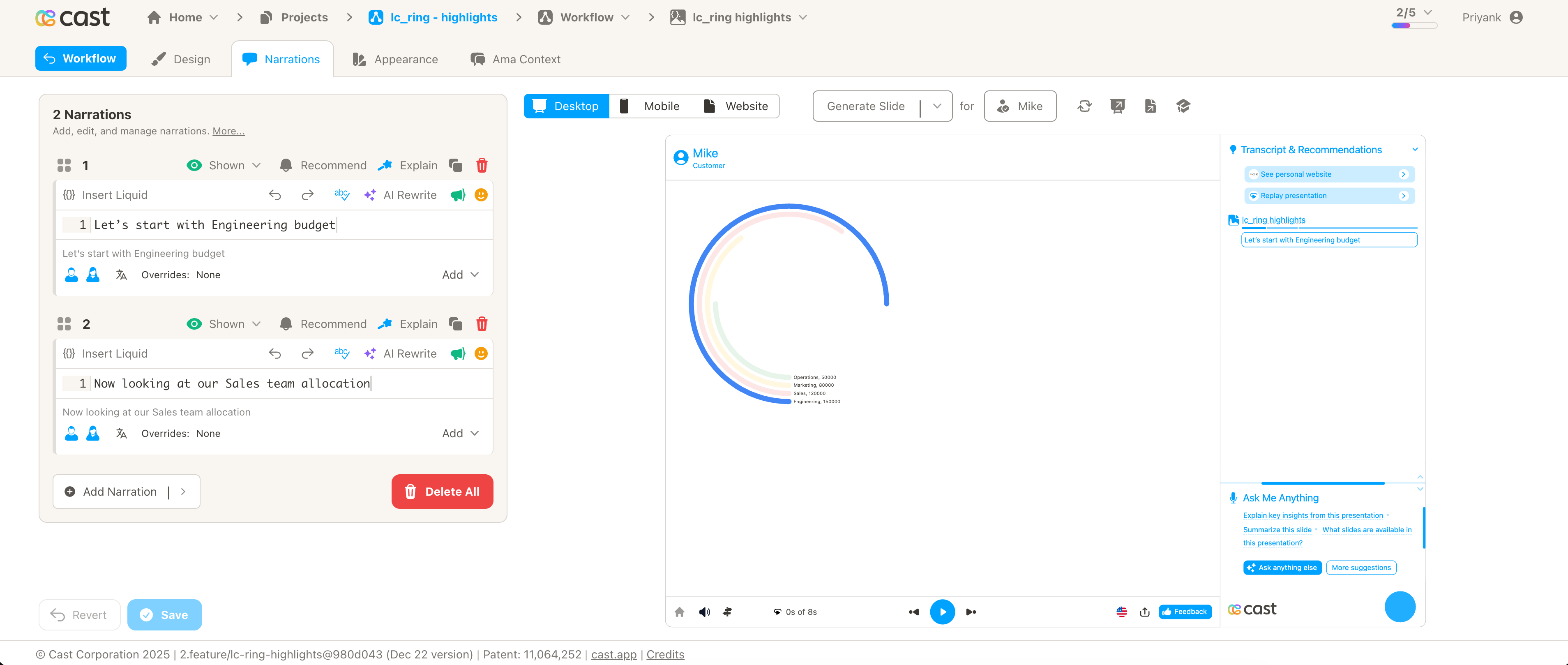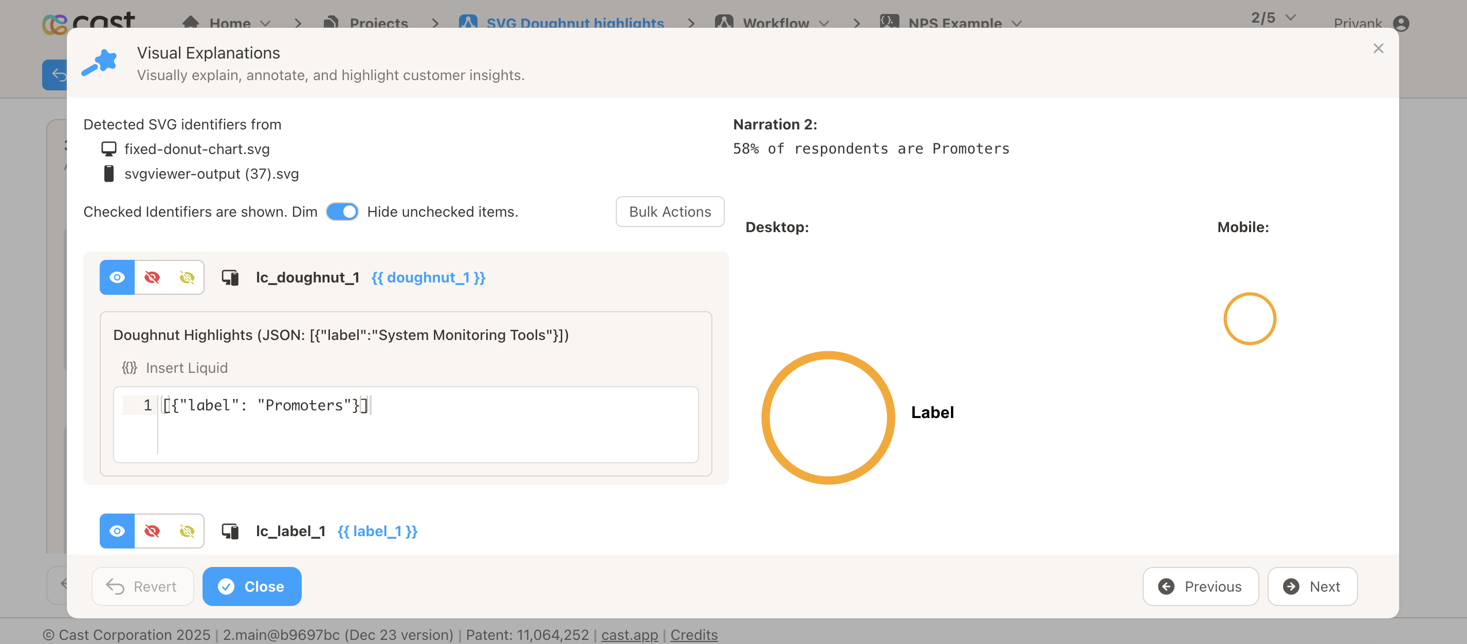 When you reference a segmentās label in your narration, that segment automatically highlights (full brightness with increased thickness) while other segments dim to about 12% brightness. This creates a strong visual focus on the data youāre discussing.